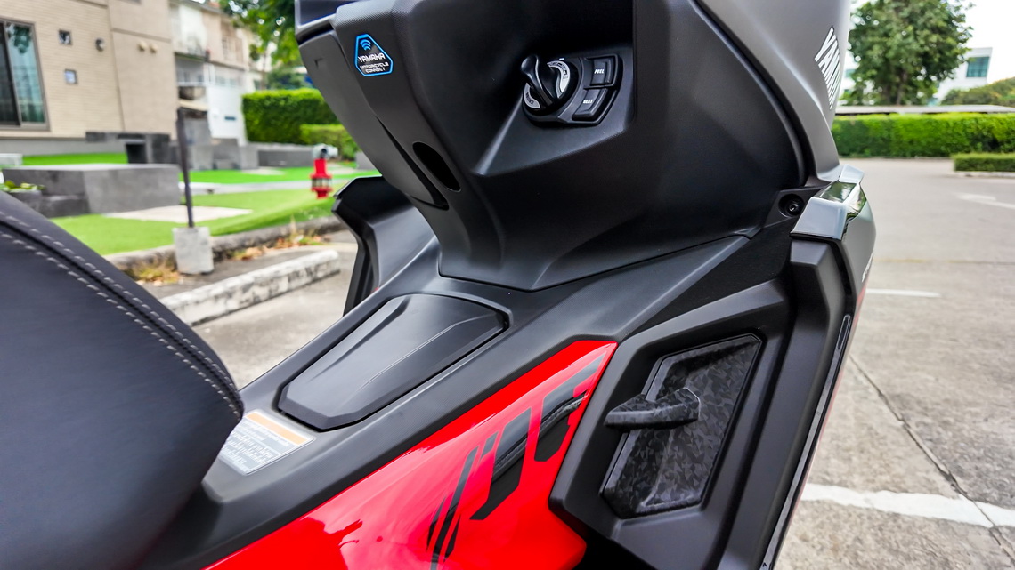 3. พื้นที่ใต้เบาะที่กว้างขวาง : เมื่อถังน้ำมันย้ายไปอยู่ตรงอุโมงค์กลาง พื้นที่ใต้เบาะ (Mega Box) จึงว่างลง ทำให้ Yamaha สามารถออกแบบช่องเก็บของขนาดใหญ่ 25 ลิตร ซึ่งใส่หมวกกันน็อกแบบเต็มใบได้สบายๆ โดยที่ไม่ต้องขยายขนาดตัวรถให้เทอะทะ