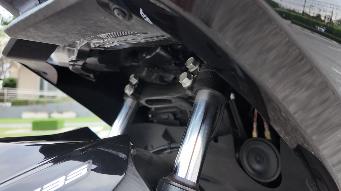 ระยะเทรลที่เพิ่มขึ้นช่วยให้ล้อหน้ามีความเสถียรมากขึ้น โดยเฉพาะเมื่อใช้ความเร็วสูง รถจะนิ่ง ไม่ไวเกินไป ลดอาการส่ายหรือไม่นิ่งในช่วงทางตรง และยังช่วยเพิ่มความมั่นใจในจังหวะเข้าโค้งยาวๆ ทำให้ All New Yamaha AEROX ให้ความรู้สึกใกล้เคียงรถสปอร์ตมากกว่าสกู๊ตเตอร์ทั่วไปอย่างชัดเจน