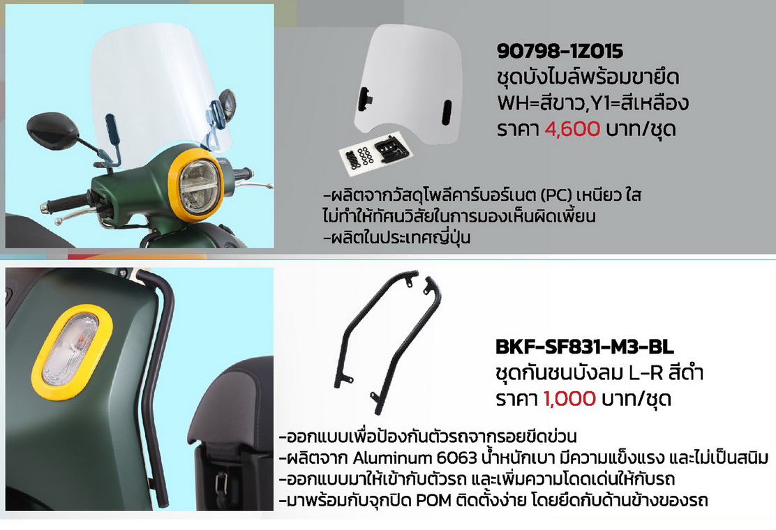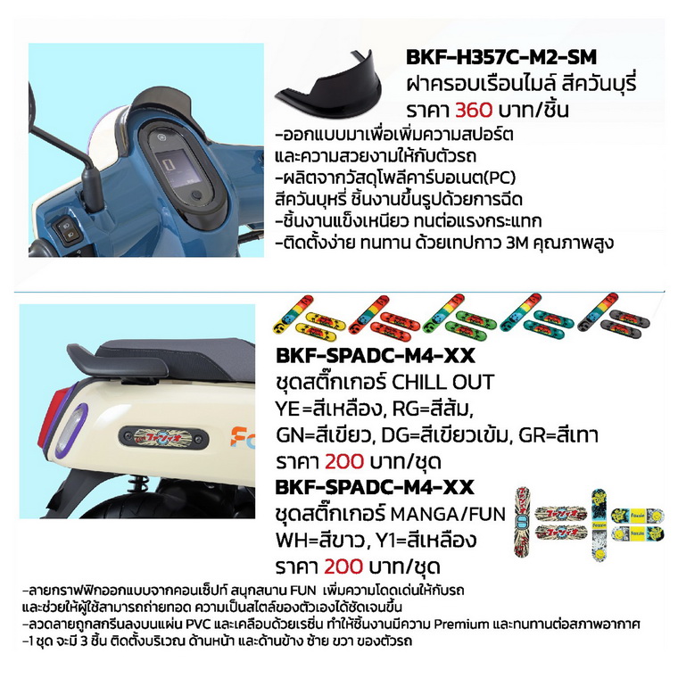สำหรับ ACCESSORIES อุปกรณ์ตกแต่งยามาฮ่าแท้! ของ YAMAHA FAZZIO HYBRID CONNECTED มีให้เลือกตกแต่งตั้งแต่หัวจดท้ายและหลากหลายสไตล์แล้วแต่ความชอบของแต่ละคน เริ่มจาก ชุดฝาครอบไฟหน้า-ฝาครอบไฟท้าย-ฝาครอบไฟเลี้ยวหน้าและไฟเลี้ยวหลัง ที่มีสีสันให้เลือกมากถึง 10 เฉดสี โดยชิ้นงานถูกออกแบบให้เข้ากับรูปทรงของชุดไฟเพื่อเพิ่มความโดดเด่นและเอกลํกษณ์ให้กับตัวรถ, ฝาครอบเรือนไมล์สีควันบุหรี่ผลิตจากโพลีคาร์บอเนต ( PC) เพิ่มความสปอร์ตและความสวยงามให้กับตัวรถ, ชุดบังไมล์พร้อมขายึดช่วยบังลมด้านหน้าให้กับผู้ขับขี่แต่ไม่ทำให้ทัศนวิสัยการมองผิดเพี้ยน โดยผลิตจากประเทศญี่ปุ่น