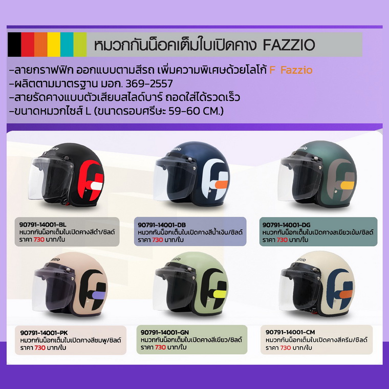 อีกทั้งยังมี หมวกกันน็อคเต็มใบแบบเปิดคาง FAZZIO ที่มาพร้อมกับลายกราฟฟิกโดยออกแบบตามสีรถ และเพิ่มความพิเศษดวยโลโก้ F Fazzio สายรัดคางแบบตัวเสียบสไลด์บาร์ที่สามารถถอดใส่ได้อ่ยางรวดเร็ว ผลิตตามมาตรฐาน มอก. 369-2557 ขนาดหมวกไซส์ L มีให้เลือกด้วยกัน 6 สีตามเฉดสีของ YAMAHA FAZZIO HYBRID CONNECTED