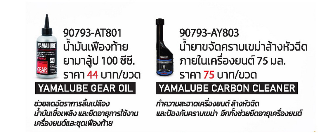 นอกจากนี้ยังมีผลิตหล่อลื่นและเคมีภัณฑ์จาก YAMALUBE ไว้ให้บริการอย่างครบครัน ไม่ว่าจะเป็น น้ำมันเครื่องสังเคราะห์แท้ YAMALUBE AT PRENIUM PLUS หรือ YAMALUBE BLUE CORE, น้ำมันเฟืองท้าย YAMALUBE GEAR OIL, น้ำมันเบรก YAMALUBE BRAKE FLUID, น้ำยาขจัดคราบเขม่าล้างหัวฉีดภายในเครื่องยนต์ YAMALUBE CARBON CLEANER และน้ำยาทำความสะอาด YAMALUBE PARTS CLEANER