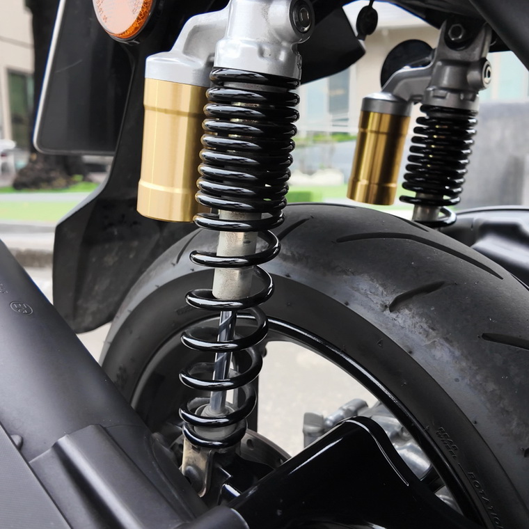 • ในส่วนของระบบกันสะเทือนด้านหน้า มีการอัพเกรดโช้คอัพหน้าให้มีขนาดแกนโช้คที่ใหญ่ โดยมีขนาดอยู่ที่ 30 มม. เพิ่มความเสถียรของการขับขี่แบบสปอร์ตในขณะเข้าโค้ง และรองรับแรงกระแทกได้ดียิ่งขึ้น ส่วนโช้คอัพหลังเป็นแบบโช้คคู่รูปทรงแบบมีซับแทงค์ นอกจากจะให้การซับแรงได้ดีแล้วยังให้เร้าอารมณ์สไตล์รถสปอร์ตแบบเต็มอารมณ์