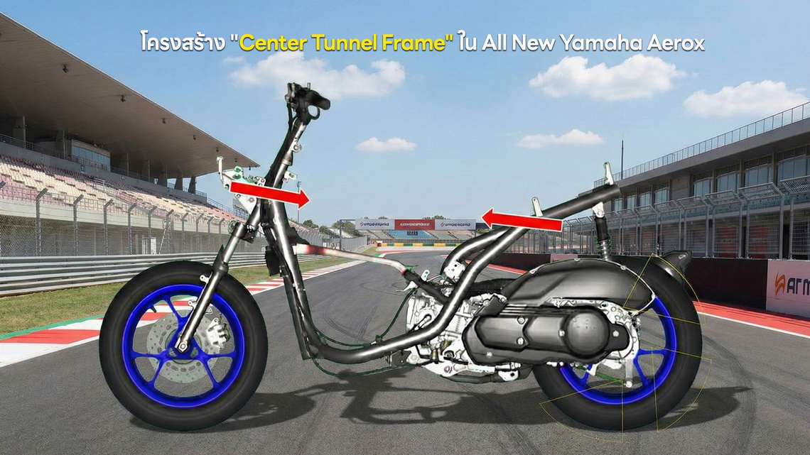 • นอกจากนี้ All New Yamaha AEROX ยังมาพร้อมกับโครงสร้างตัวรถแบบ Center Tunnel Frame ที่ได้รับการเสริมความแข็งแรงและลดการบิดตัวของเฟรม ด้วยการเสริมคานบริเวณตรงกลางตัวถัง ช่วยลดอาการสั่นสะเทือนของตัวรถ รวมถึงบริเวณตัวถังตรงกลางมีการปรับขนาดใหม่ เพื่อรองรับท่าทางการขี่ที่สปอร์ตขึ้น และมีการปรับท่านั่งขับขี่ที่ออกแบบให้ที่วางเท้าได้ถอยไปด้านหลังมากขึ้น รวมถึงการปรับความกว้างและองศาของแฮนเดิ้ลบาร์ ทำให้สามารถควบคุมรถได้อย่างกระชับและได้ฟีลลิ่งสปอร์ตมากยิ่งขึ้น ซึ่งจุดนี้ทำให้ All New Yamaha AEROX มีความเสถียรมั่นคงมากกว่ารถออโตเมติกทั่วไป ทั้งในช่วงการขับขี่ด้วยความเร็วและในช่วงจังหวะการเข้าโค้ง ทำให้ผู้ขับขี่เกิดความมั่นใจและสนุกกับการขับขี่ได้มากยิ่งขึ้น