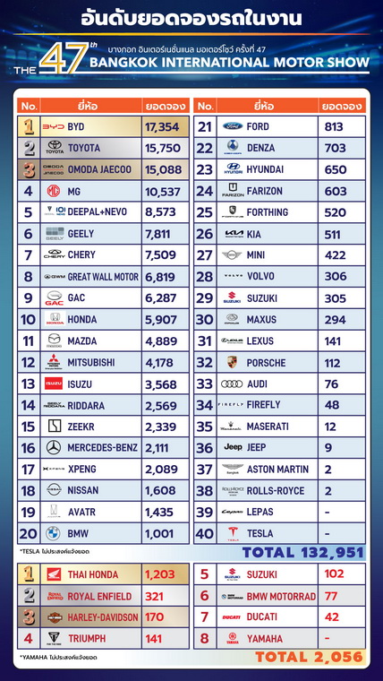 ปิดฉากลงอย่างสวยงาม สำหรับงาน Bangkok International Motor Show ครั้งที่ 47 ซึ่งจัดโดย บริษัท กรังด์ปรีซ์ อินเตอร์เนชั่นแนล จำกัด (มหาชน) ภายใต้ธีม “The ICONIC SYNCHRONICITY” หรือ บริบทแห่งการขับเคลื่อนไร้ที่ติ ที่จัดขึ้นท่ามกลางสภาวะความผันผวนด้านพลังงาน เนื่องจากความไม่สงบในตะวันออกกลาง แต่การจัดงานยังคงได้รับความสนใจอย่างล้นหลามจากผู้บริโภคและผู้ประกอบการในอุตสาหกรรมยานยนต์ โดยตลอดระยะเวลาการจัดงานสามารถสร้างยอดจองรถยนต์ 132,951 คัน และรถจักรยานยนต์ 2,056 คัน ยอดผู้เข้าชมงานรวมทั้งสิ้น 1,798,312 คน สะท้อนถึงกำลังซื้อ และความเชื่อมั่นของตลาดที่เริ่มฟื้นตัวอย่างต่อเนื่อง